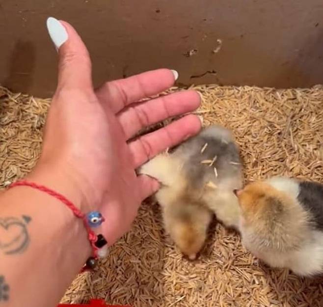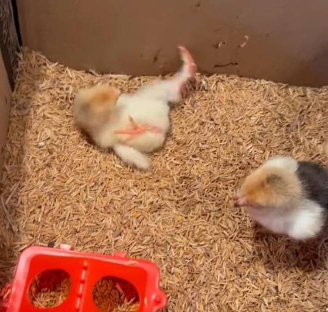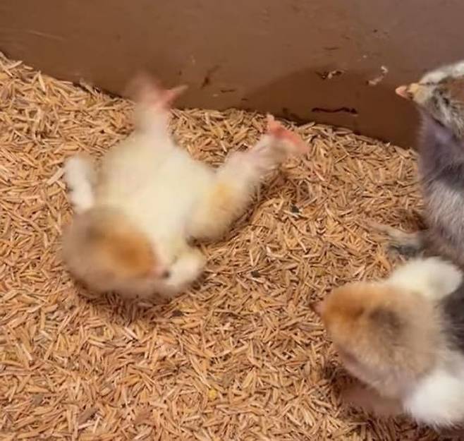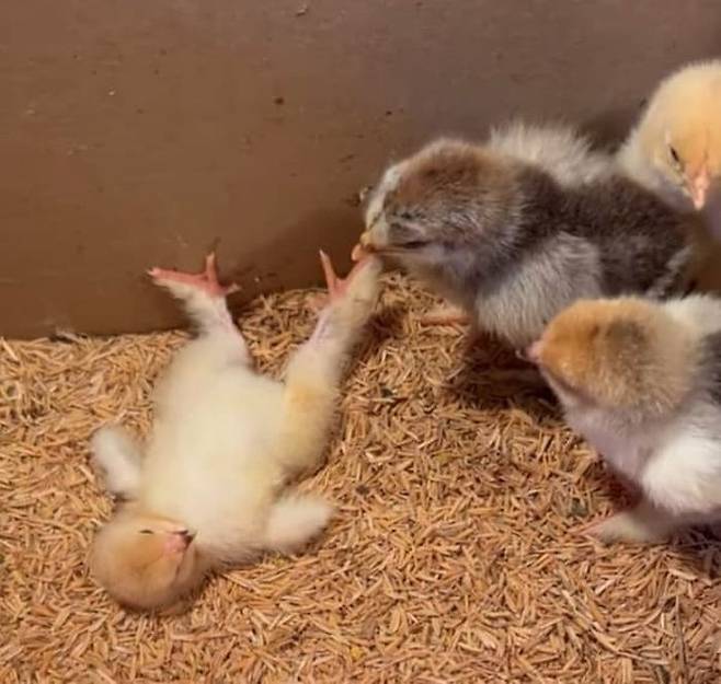 공개된 영상 속에는 노란 솜털이 보송보송한 병아리들이 여럿 모여 있었는데요. 그중 한마리가 등을 바닥에 대고 꼼짝없이 누워 있었습니다.