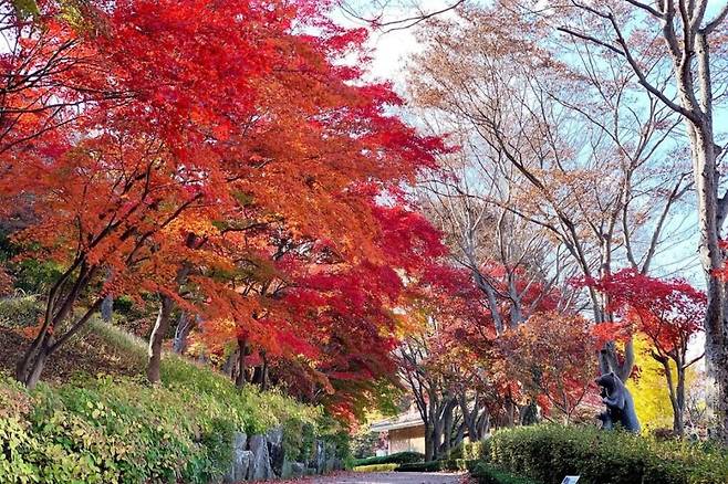 베어트리파크의 산책 길은 붉은 단풍과 노란 은행나무로 물들어 형형색색 아름다운 풍경을 형성하고 있다.
