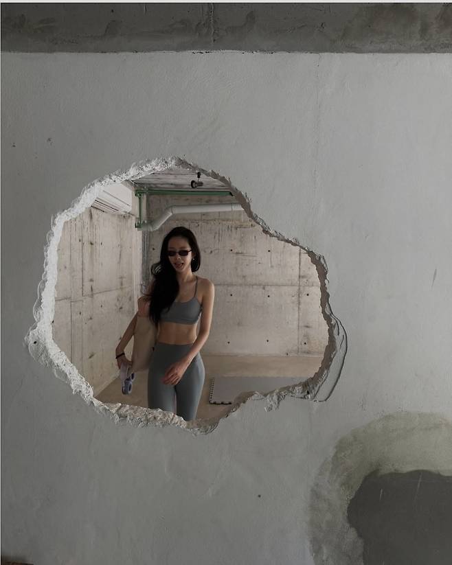 손나은은 회색 계열의 브라톱과 하이웨이스트 레깅스를 매치해 완벽한 보디라인을 강조했으며 여기에 블랙 선글라스를 더해 스포티하면서도 시크한 분위기를 연출했습니다.