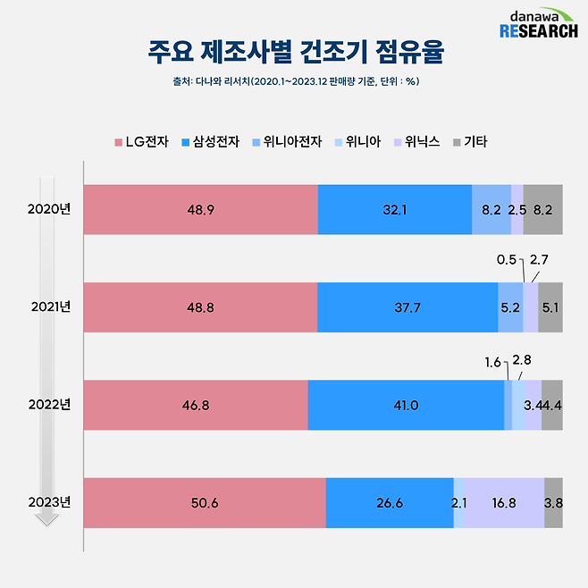 삼성전자 건조기는 점유율이 지난해 크게 줄어들었으며, 오브제컬렉션과 같은 고급 라인업도 두루두루 잘 나간 LG전자와 달리 보급형 라인업 위주로 제품이 판매되었다. 위닉스의 약진도 눈에 띄는 부분. 2023년 출시한 4kg 미니건조기를 중심으로 판매량이 크게 늘어났다.