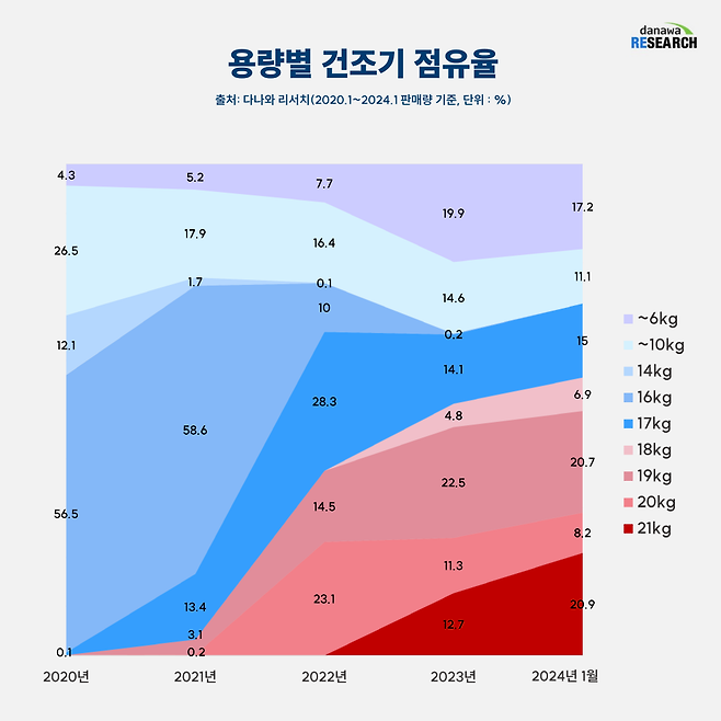 이러한 가운데, 소형 건조기(6kg 이하)도 2020년부터 2023년까지 점유율이 꾸준히 늘어나고 있다. 1인 가구의 증가, 기존 건조기의 보조적 용도로 찾는 사람들이 늘어난 것이 원인으로 보인다.