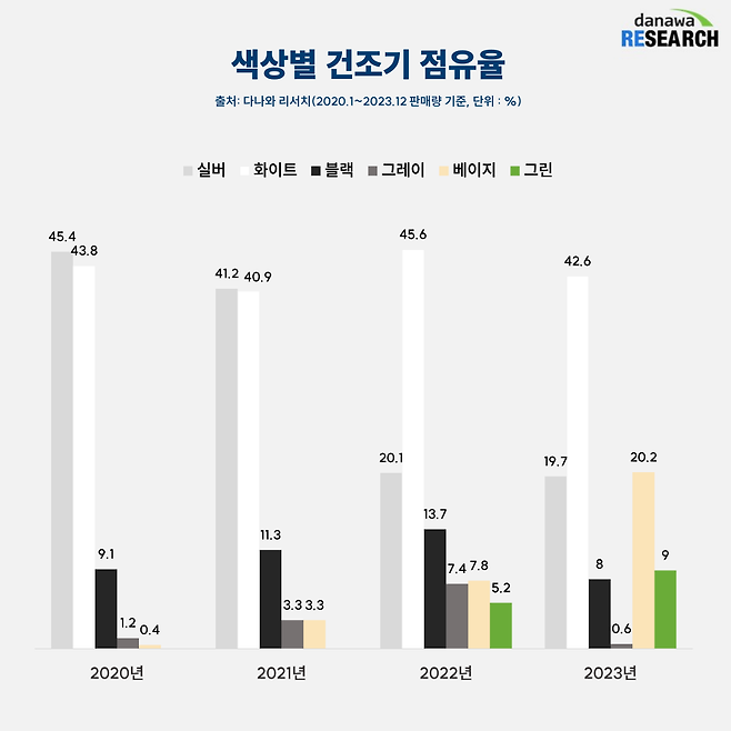 LG전자 오브제, 삼성전자 비스포크 같은 인테리어 가전이 등장한 이후, 가전제품의 인테리어 효과에 주목한 소비자가 늘어난 것. 대표적으로 떠오른 색상이 베이지와 그린이다. 건조기와 같은 대형 가전은 부피가 커 튀는 색상은 부담스러운데, 베이지/그린은 부드럽고 편안한 느낌이고 주변 인테리어와도 무난하게 어울려 찾는 이들이 많은 것으로 보인다.