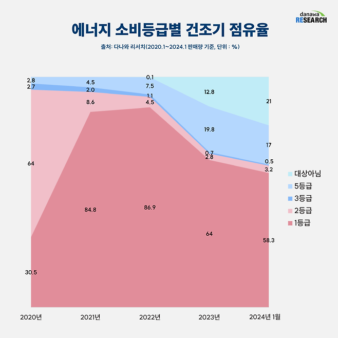 에너지소비효율 등급별 점유율도 많이 달라졌다. 2022년만 해도 1등급이 독보적이었으나, 지난해에는 64%로 크게 줄어들었다. 대신 5등급 제품은 점유율이 늘어났다. 6kg 이하 미니건조기 판매량이 늘어난 것이 원인이다. 미니건조기는 열풍으로 옷감을 말리는 히터식 특성상 소비전력이 많아 거진 다 5등급이다.