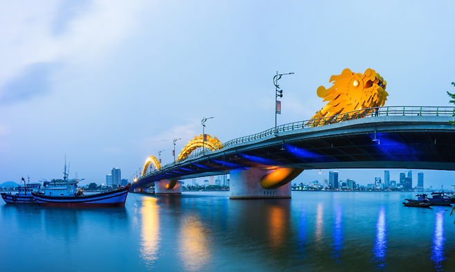 다낭의 대표 랜드마크 중 하나인 용다리는 야경을 좋아하는 사람들에게는 빼놓을 수 없는 필수 스팟이에요. 이 다리는 다낭 시내를 가로지르는 한강 위에 거대한 용의 모습을 형상화한 다리로, 밤이 되면 이 용이 살아난 듯 화려한 조명과 함께 멋진 불쇼를 펼쳐요.