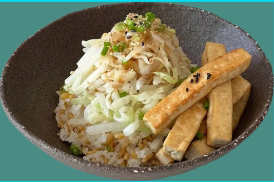 구운 두부를 그릇에 담은 흰쌀밥 위에 올린다