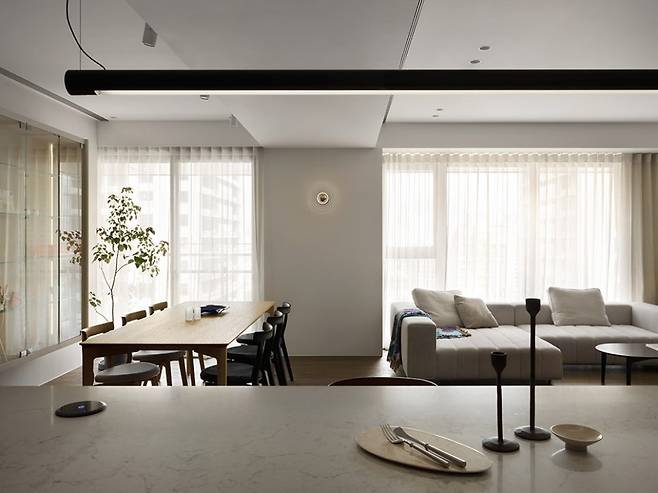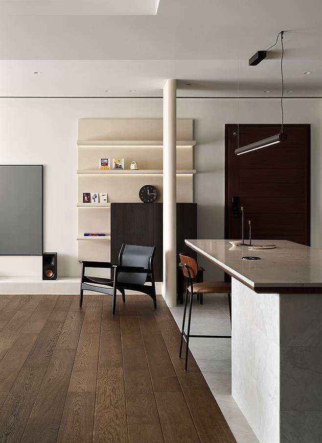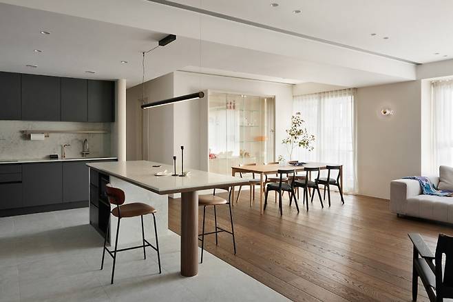 소파-아일랜드-식탁이 하나의 원처럼 연결됐다. 어디에 있든 자연스럽게 소통할 수 있는 구조다.
