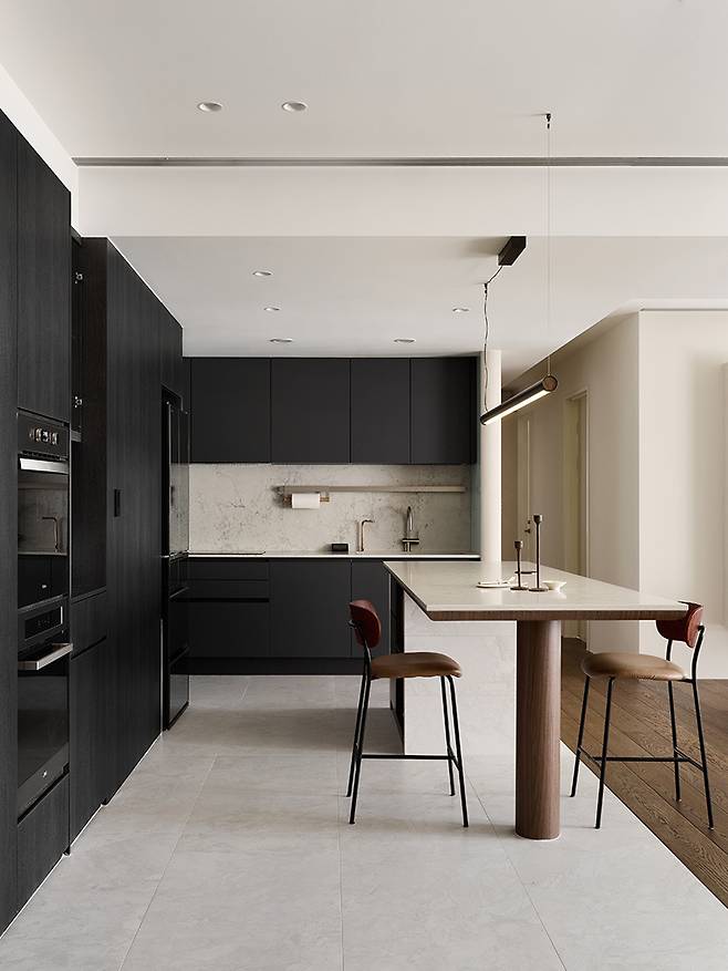 주방은 ㄱ자 구조다. 화이트 시스템 가구에 빌트인 오븐과 냉장고를 넣었다. 좌측 벽면은 다크 컬러로 마감해 가전제품을 모아두고 시각적으로 정리했다.
