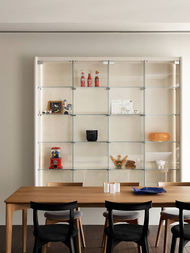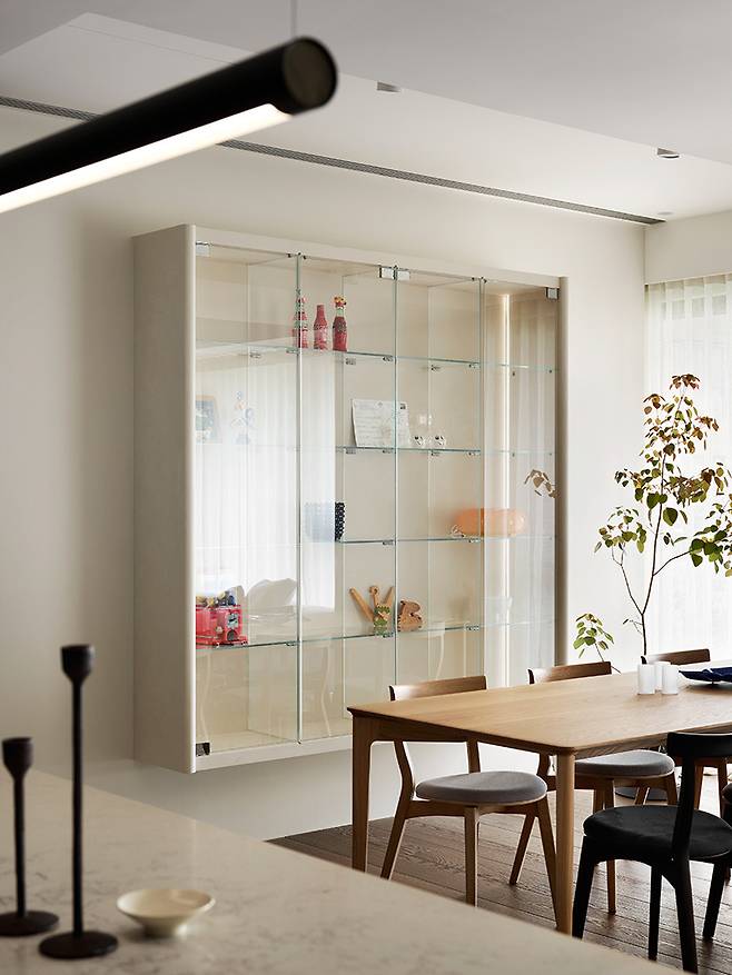 식탁 뒤 벽면엔 간접조명이 들어간 유리 선반이 층층이 걸려 있다. 원목 배경에 유리 층판을 얹어 책과 소품을 디스플레이하고, 조명을 켜면 은은한 빛이 식탁을 감싼다.
