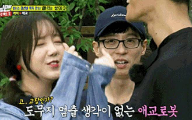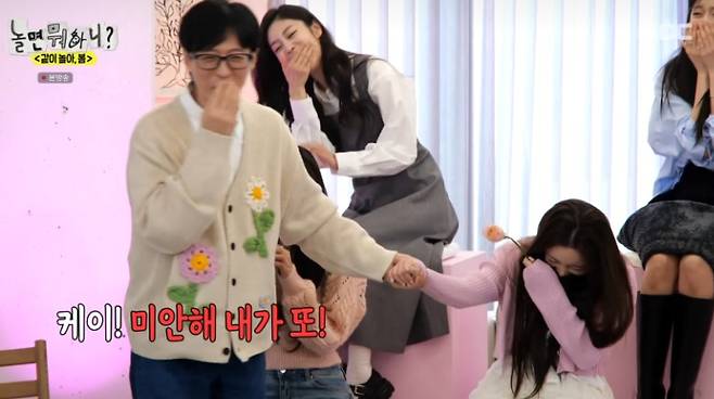 한 순간, 케이의 애교가 다시 등장한 순간이 있었으니. 활동 당시 별명을 물어보자 케이는 자연스럽게 꽃이라 말하며 꽃포즈를 지었다. 러블리즈 활동 당시 꽃케이로 불리며 화사한 미모를 자랑했던 케이다. 이런 케이의 기습애교에 잠시 회로가 정지하며 정색하는 표정을 보여준 유재석이다.