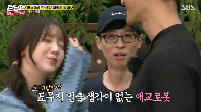 그리고 유재석을 반하게 만들기 위한 필살 애교 세트를 준비해 선보였다. “야 유재석! 내가 그렇게 안 귀여워?”라는 말과 함께 사랑스런 동작들을 반복하는 케이의 애교에 여전한 무표정으로 웃음을 안긴 유재석이다. “안 귀여워?”라는 질문에 “어”라는 답을 반복하며 케이에게 두 번째 굴욕을 선사한 유재석이다.