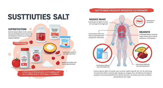 미국심장협회(AHA)는 고혈압 환자의 소금 섭취량 제한을 위해 75% 염화나트륨과 25% 염화칼륨으로 구성된 대체 소금을 권장하는 내용의 권고안을 마련했습니다. 이러한 대체 소금은 짠맛을 유지하면서도 혈압을 낮추는 효과가 있습니다.