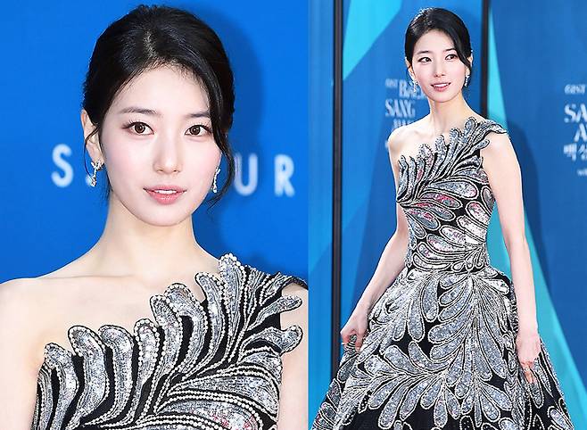 드레스는 비대칭 원숄더 디자인에 섬세한 자수와 크리스털 비딩이 더해진 리프 디테일이 전체를 감싸는 구조로, 수지의 우아한 바디라인을 더욱 돋보이게 했습니다.