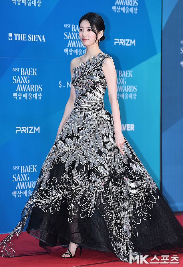 수지는 잎사귀 패턴을 정교하게 수놓은 블랙 앤 실버 컬러의 리프 드레스를 입고 등장해 완벽한 비주얼로 시선을 올킬했습니다.