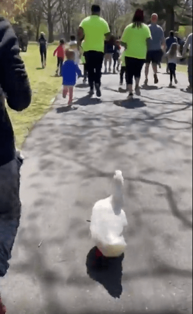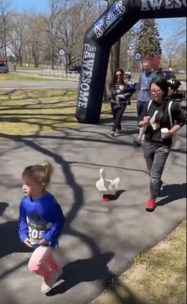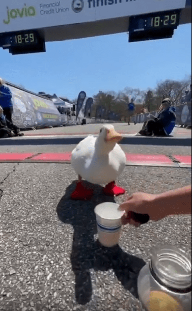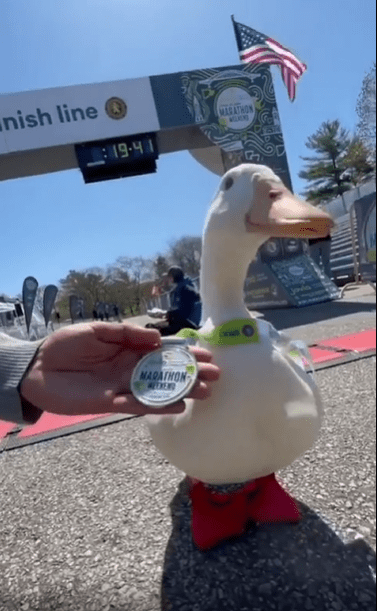 뒤뚱뒤뚱 달리는 귀여운 오리 한 마리, 수많은 러너들 사이를 지나쳐 끝내 결승선까지—진심으로 뛴 이 작은 챔피언에게 주어진 반짝이는 메달