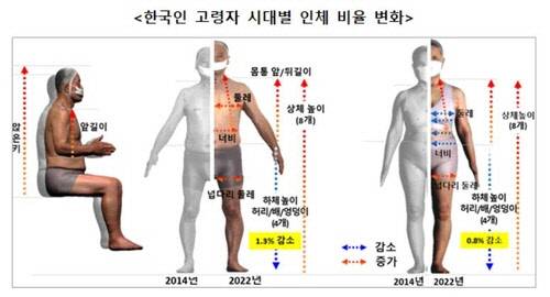 남녀 고령자 모두 체형의 변화도 확연했다. 상반신 길이인 앉은키 비율(앉은키/키)은 2014년 제2차 고령자 인체치수 조사 결과와 견줘 8년 새 남성은 52.9%에서 53.8%로, 여성은 52.3%에서 54.4%로 높아졌다. 특히 허리가 굽지 않고 바로 선 이른바 바른체형의 비율이 전체 조사 대상자의 83.4%로 역대 가장 높았다.이어 몸통 전체 축이 94도 이상인 젖힌체형은 13.8%, 87도 이하인 숙인체형이 2.8% 순이었다. 몸통 전체 축이 젖힌체형과 숙인체형의 중간인 87∼94도면서 뒤허리 등의 축이 98도 이하인 경우 바른체형으로 분류한다.