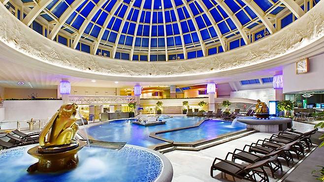 허심청의 매력은 그저 넓고 크다는 것에 그치지 않습니다. 천장을 통해 쏟아지는 자연 채광, 고풍스러운 인테리어와 예술적 조형물이 어우러진 공간은 마치 리조트에 온 듯한 분위기를 자아냅니다.