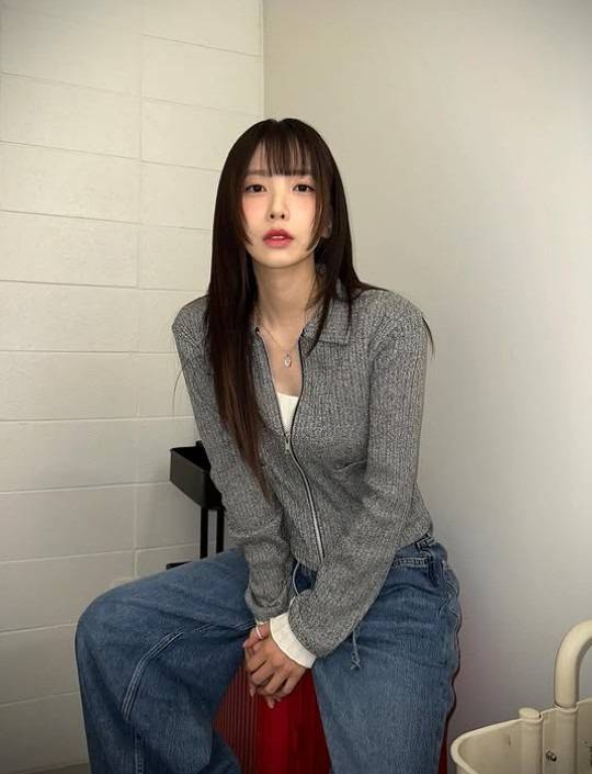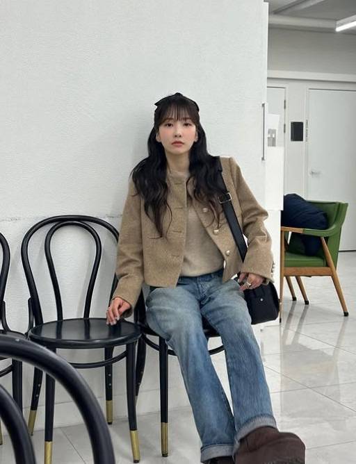 진청 컬러의 바지가 브라운의 무게감을 유지해요. 전체적으로 안정감을 줍니다.