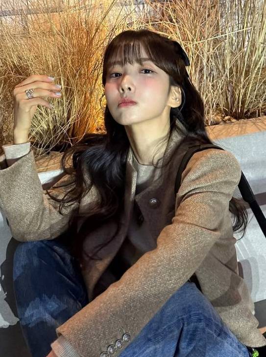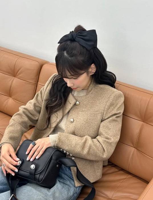틀어 올린 반묶음 머리가 귀여움을 더해요. 재킷과 가방의 단추와도 어울리도록 알이 큰 반지를 선택했네요.