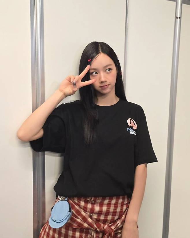 혜리는 오버핏 블랙 티셔츠에 체크 셔츠를 허리에 묶는 레트로 레이어드룩을 연출했다. 블랙 티셔츠는 가슴 부분에 귀여운 일러스트 뱃지를 더해 심플하지만 단조롭지 않게 포인트를 줬고, 버건디 톤의 체크 셔츠는 묶는 방식만으로 룩에 생동감을 불어넣었다. 여기에 미니 라이트 블루 파우치가 허리춤에 달려 있어 실용성과 스타일을 동시에 잡았다.