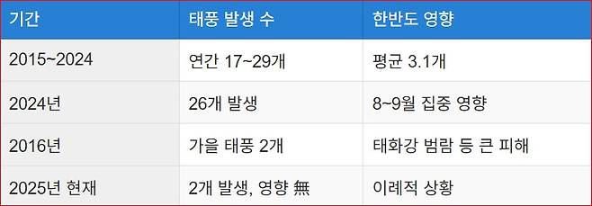 ๋ ๋๋ผ์ด ๊ฑด ์์ง๊น์ง ํ๋ฐ๋์ ์ํฅ์ ์ค ํํ์ด ํ ๊ฑด๋ ์์๋ค๋ ์ฌ์ค์ ๋๋ค. 2025๋ 1ํธ ํํ โ์ฐ๋ฅ(WUTIP)โ์ ์ค๊ตญ ๋จ๋ถ์์ ์๋ฉธํ๊ณ , 2ํธ ํํ โ์คํฟ(Sepat)โ ์ญ์ ์ผ๋ณธ ํด์์์ ์ด๋์ ์๋ถ๋ก ์ฌ๋ผ์ก์ต๋๋ค. ์ด์ฒ๋ผ ํํ์ด ๋ฆ๊ฒ ๋ฐ์ํ ํด๋ ๋ณด๊ธฐ ๋๋ฌธ๋ฐ์. ์ค์ ๋ก 1ํธ ํํ์ด 5์์ด ์ง๋์์ผ ๋ฐ์ํ ๊ฑด 2016๋ ์ดํ 9๋ ๋ง์ด๋ผ๊ณ ํฉ๋๋ค.