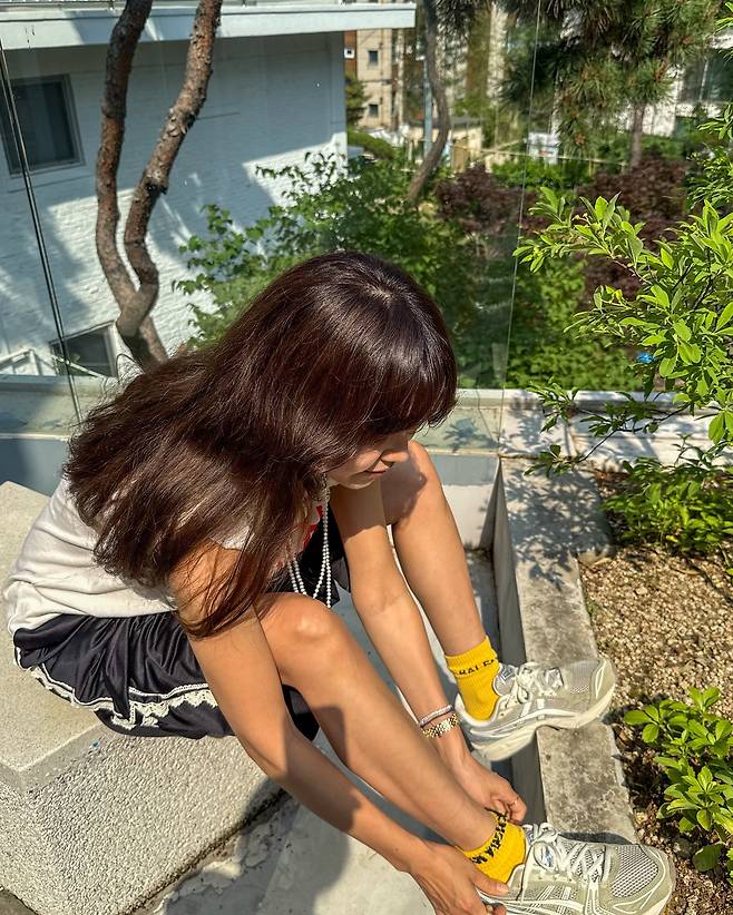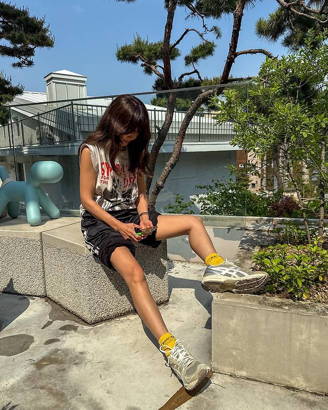 여기에 옐로 양말과 스니커즈 조합은 시선을 확 사로잡는 포인트.