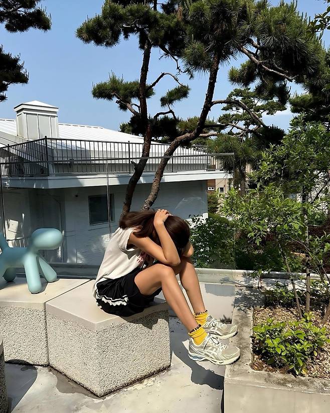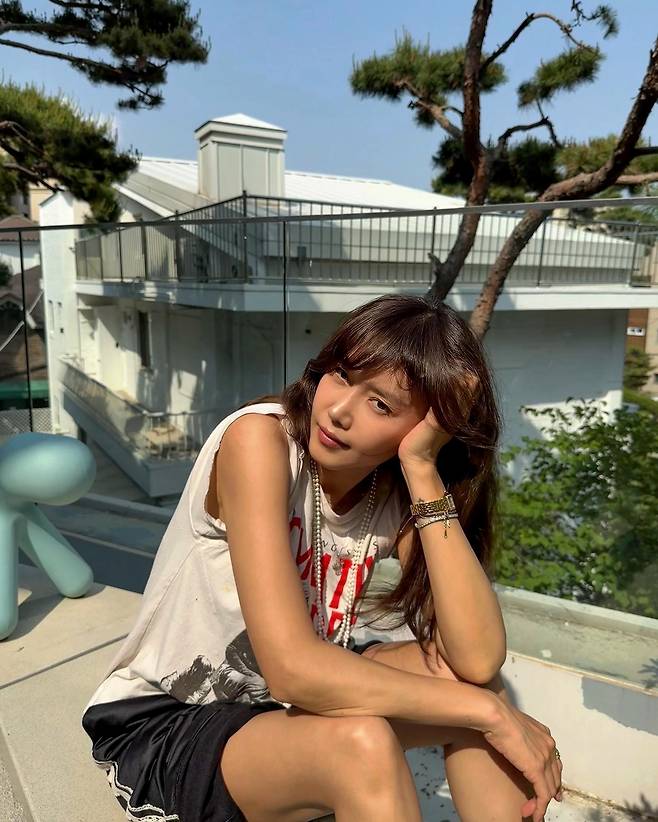 무심한 듯 앉은 포즈도 멋스럽고, 선글라스를 벗어도 자신감 넘치는 표정이 스타일의 일부처럼 보이네요.