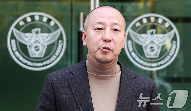 (서울=뉴스1) 김성진 기자 = 한동훈 대표의 가족 이름을 사용한 국민의힘 당원을 정보통신망법 위반 혐의로 경찰에 고발한 오상종 자유대한호국단 대표가 22일 서울 종로구 서울경찰청 사이버수사대에서 고발인 조사를 받기 위해 출석하며 입장을 밝히고 있다.