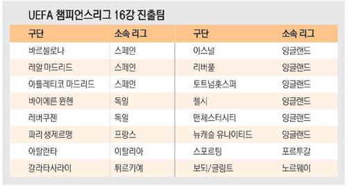 스페인 프리메라리가에서는 EPL의 절반인 레알 마드리드·바르셀로나·아틀레티코 마드리드 등 3곳이 16강에 올랐다. 독일 분데스리가에서는 바이에른 뮌헨·레버쿠젠 등 2곳이 진출했다. 프랑스 리그1에서는 파리 생제르맹, 이탈리아 세리에A에서는 아탈란타가 올랐다. 유럽 5대 리그 가운데 16강 진출팀을 1개 팀만 배출한 곳은 리그1과 세리에A뿐이다.