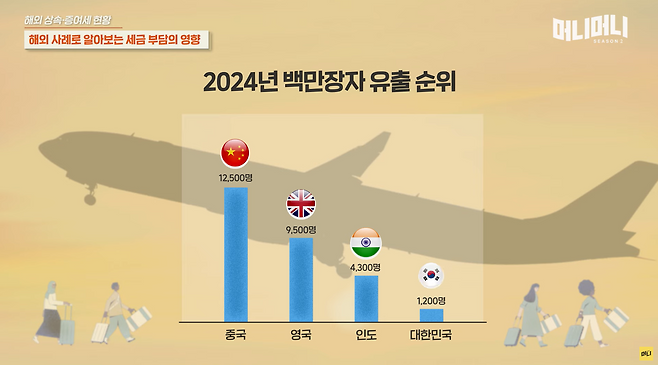 글로벌 투자이민 자문사 헨리 앤 파트너스가 최근 발표한 ‘2024년 부의 이동’ 보고서에 따르면 우리나라는 올해 약 1200명의 백만장자가 해외로 유출, 중국과 영국, 인도에 이어 4위를 차지할 것으로 예상됐다. 우크라이나와 전쟁 중인 러시아(5위) 보다도 부자 유출이 많을 것으로 본 것이다.