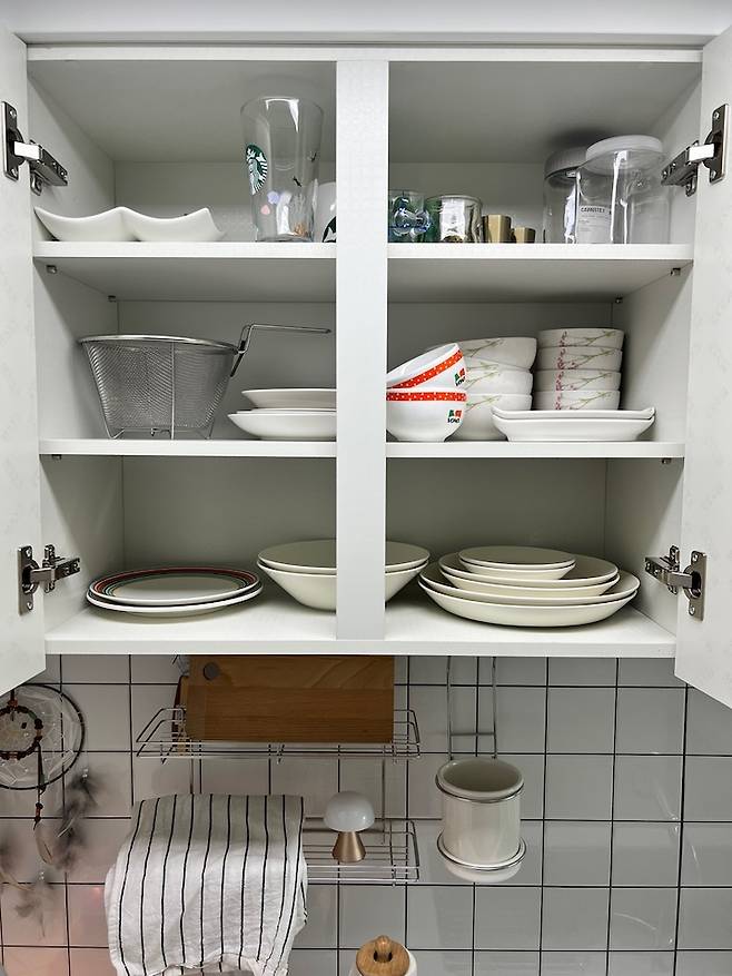 다만 아쉬운 점은 양념장 슬라이딩 선반을 설치할 공간이 없다는 거에요. 그리고 상부장 크기를 줄이고 선반을 넣었더니 와인잔이 안 들어갑니다! 하부장에 넣을 순 있지만 아쉬운 부분이에요:) 선반이 고정이 아니라 조절 가능한 거였으면 좋겠다고 생각했습니다~