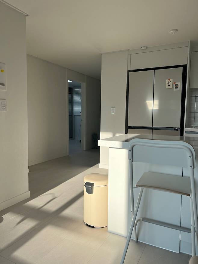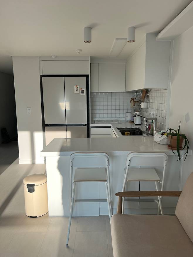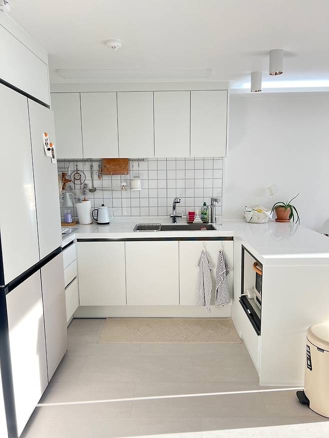 설거지하고 햇빛이 막 들어올 때가 예뻐서 찍었던 사진이에요! 저희는 솔직히 요리를 많이 안 해먹어서, 2도어 냉장고를 하고 딱 맞게 하고 싶었는데 주변에서 그래도 4도어는 해야 한다는 소리에 비스포크 키친핏 4도어를 하게 되었어요. 지금 보면 양옆이 많이 남아서 아쉽지만 멀리 보면 예쁘답니다! 색은 진리의 코타화이트/새틴베이지입니다:)
