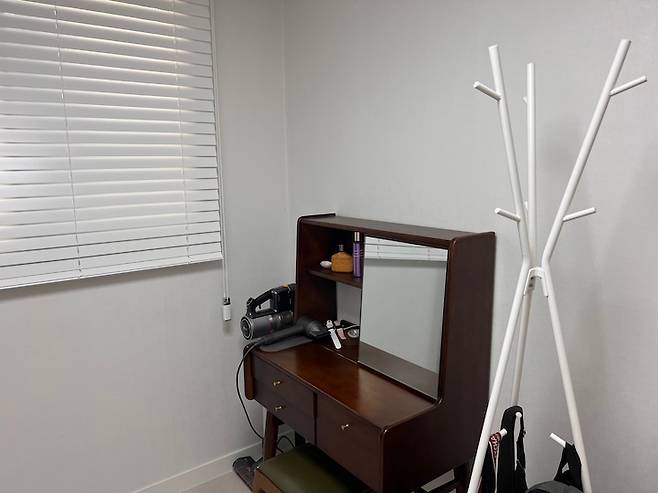 반대편은 화장대와 옷걸이로 구성되어 있어요~ 화장대에 화장품은 한쪽에 몰아두고 거울을 왔다 갔다 하면서 사용하고 있습니다! 청소기도 아예 여기에 둬서 머리 말리고 청소기 돌릴 수 있도록 동선을 고려했습니다. 옷방에 잠옷 걸어두고 가면 좋을 것 같아서, 가방 걸이 겸 옷걸이로 샀는데 이케아 제품은 정말 저렴하고 튼튼한 것 같아요! 대 만족하면서 사용하고 있습니다.