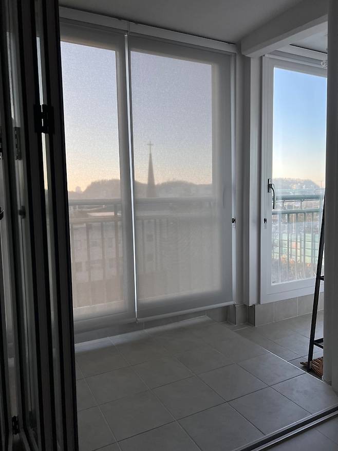 마지막으로 저희 집 베란다 블라인드입니다! 폴딩도어 쪽에는 커튼을 하지 않아서 사생활 보호 차원으로 필요했던 블라인드입니다. 근데 너무 답답한 건 싫을 것 같아서 창안애 매시 느낌의 그레이 선스크린 블라인드를 사용했습니다! 그레이 색상이라 오염이 티가 잘 안 나고, 그래도 블라인드라고 방한 효과가 꽤 있어요. ㅎㅎ 무엇보다도 답답하지 않게 사용할 수 있어서 추천합니다. 블라인드를 할 때쯤은 모든 게 귀찮아져서 방문견적 시공으로 진행했어요. 창안애에서 저렴하게 할 수 있어서 만족합니다.