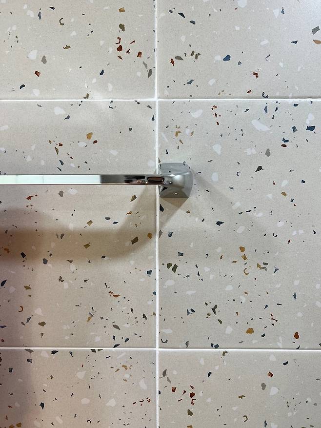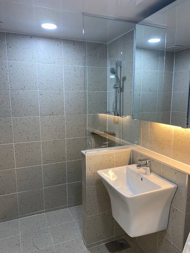 화장실은 호텔식 화장실을 꿈꿨지만! 귀여운 테라조 타일로 완성했어요. 300*300 타일이라 귀여운 느낌이 가득합니다. 유리 파티션만 했을 때 물 때 끼는 게 너무 싫어서 저희는 조적 파티션을 쌓고 그 위에 유리 파티션을 올렸어요. 거울도 요즘 유행하는 거울은 아니지만 화장실에 이것저것 쟁여두는 타입이라 서랍장 형 슬라이딩 거울을 선택했습니다:)