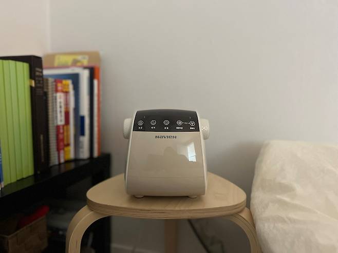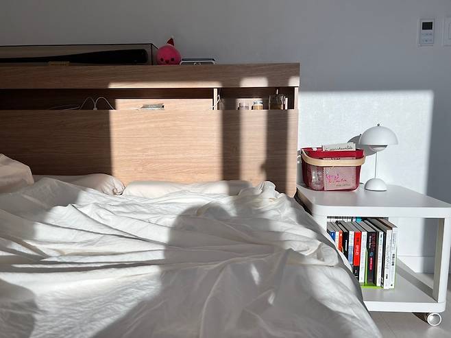 옆에 협탁도 새로 사야지 했는데, 결국 자취할 때부터 쓰던 이케아 협탁을 쓰게 됐어요. 예전에는 화장대로도 쓰고 책장으로도 썼는데, 지금은 책장 겸 협탁으로 쓰고 있네요 :)