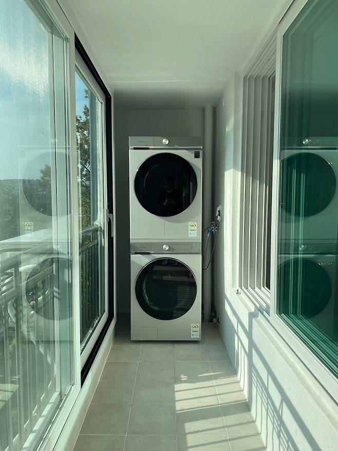 저희는 베란다에만 세탁기를 둘 수 있었어요! 다행히 단차를 맞추는 작업을 하지 않아도 됐었고, 삼성 AI 그랑데 세탁기 건조기를 설치할 수 있었답니다.