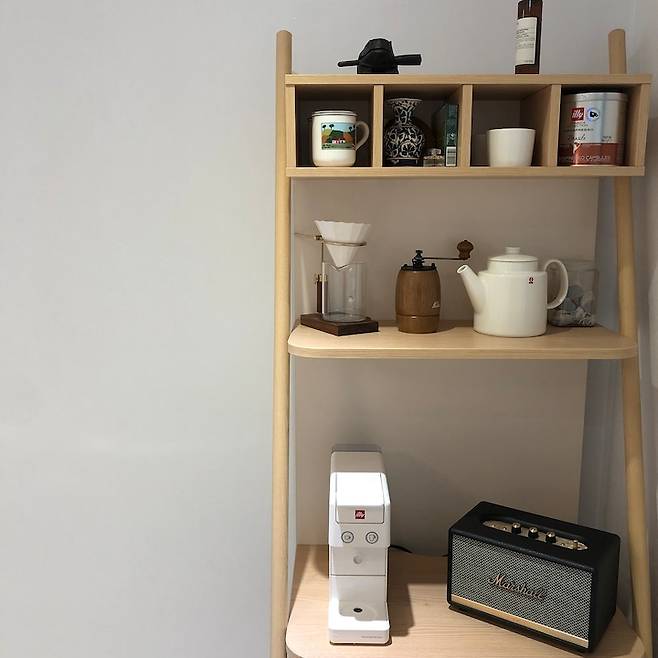 다이닝룸 한쪽에는 제가 좋아하는 걸 모두 모아둔 커피장도 있어요. 일룸 커피장인데, 매일 커피를 수혈받아야 해서 매일 같이 쓰고 있는 중입니다. 여기에 있는 것 중에 마샬 스피커랑, 터키에서 사 온 화병을 제외하고는 다 선물 받은 것들이에요. 항상 사랑받고 있다는 걸 알려주는 공간이기도 합니다 ♥