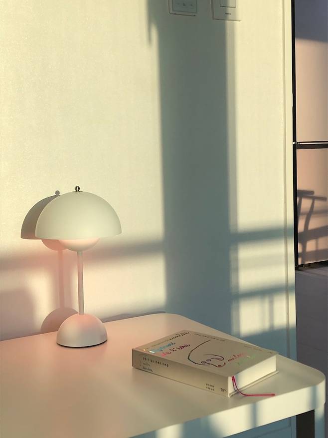 앤트레디션 조명도 생일선물로 받았는데, 색상 고르느라 한참 걸렸어요! 포인트를 주는 색으로 할까 고민했지만 무난하게 매트 화이트를 골랐는데 여기저기 두기 좋아서 추천합니다. 친구가 놀러 와서 작품을 남겨두고 갔어요! 사진 찍는 센스는 타고나는 거라는 걸 깨달은 순간이랍니다:)