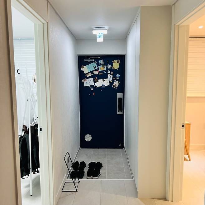 요즘 많이 하시는 신발장 하부 띄움 공사도 원래는 하기로 했는데, 소음 민원이 들어온 이후로 안 하기로 수정했어요. 아쉽지만 그래도 화이트 집에 파란색으로 포인트를 줬습니다. 저희의 추억이 담긴 것들을 덕지덕지 붙여 놓는 공간이기도 해요. ^^