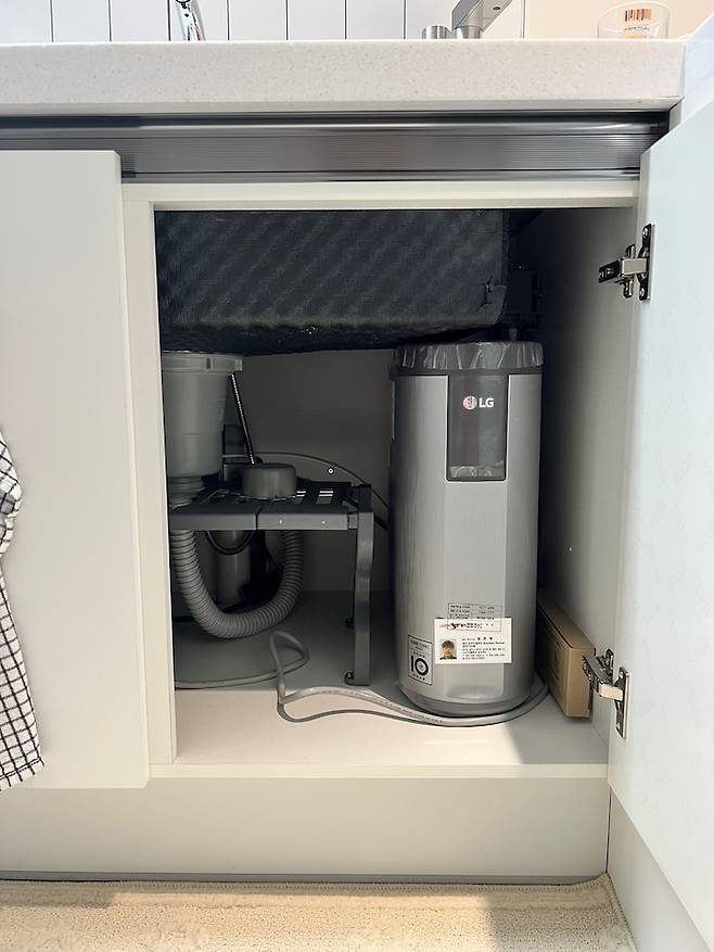 싱크볼이 생각보다 크기를 많이 잡아먹는 걸 몰랐습니다! 하부장 쪽에 공간이 이만큼 밖에 없어서 정수기가 들어갈까 말까 정말 조마조마했는데, 빈틈없이 딱!!! 맞게 들어갔습니다. 인테리어 공사하면서 가장 힘들었던 게 가전 들어가는 거였어요. 인테리어 할 때 사장님이 잘 안 챙겨주실 수도 있으니 꼭!! 설치 사이즈를 확인하시길 바랍니다. 참고로 저희는 인덕션 깊이가 안 맞아서 인덕션 설치도 일주일 정도 더 늦춰졌답니다.