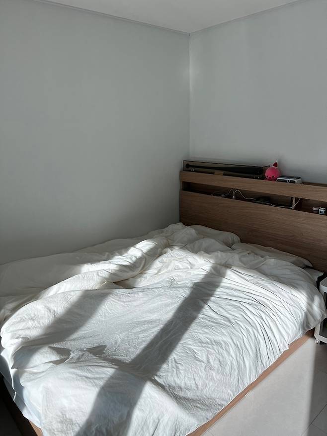 왼쪽 벽엔 TV가 있고, 아직 책장을 사지 못해서 기존에 가지고 있던 선반 위에 올려두었습니다! 공기청정기와 온수 매트까지 있어서 조금 정리 안된 것 같은 방이에요. 저희는 둘 다 이불을 돌돌 말아서 자는 타입이라서 각자 이불을 샀어요. ㅎㅎ 데코뷰에서 워셔블 솜과 함께 사각사각 소리가 나는 이불커버도 함께 구매했습니다.