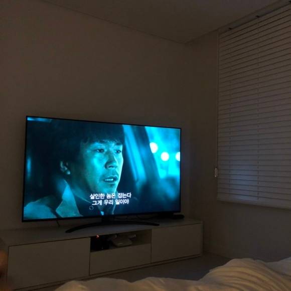안방에 TV를 둘까 말까 고민했는데, 안방에 TV 있으니까 너~무 좋은 거 있죠? 저희는 TV 보면서 밥 먹었었는데 오히려 밥 먹을 때 대화하게 되니까 좋고 자기 전에 같이 넷플릭스나 디즈니 한 편 보고 자니까 딱 좋더라고요. 각도가 애매할까 봐 걱정했는데 TV가 커서 괜찮았습니다 :)