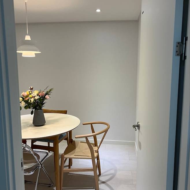 지나갈 때마다 보이는 이 조명과 의자가 참 좋아요. 두왑 펜던트 조명은 2700k의 이케아 전구를 사용했고, 다운라이트는 주광색으로 해서 밝기를 더해줬습니다. 테이블은 세레스 홈에서 산 아이보리 원형 테이블과 세트로 의자를 같이 샀었어요! 근데 손님도 오시고 해서 추가로 접의식 의자 하나와 라탄 의자 하나를 더 추가 구입했습니다:)