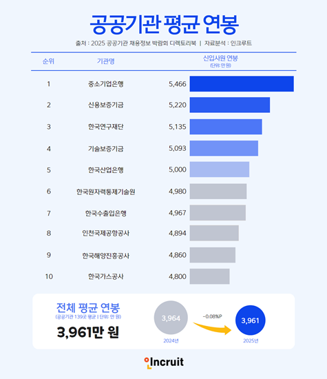 올해 공공기관의 전일제 기준 신입 평균 연봉은 3,961만 원으로 2024년(3,964만 원)보다 0.08%P 감소했다.