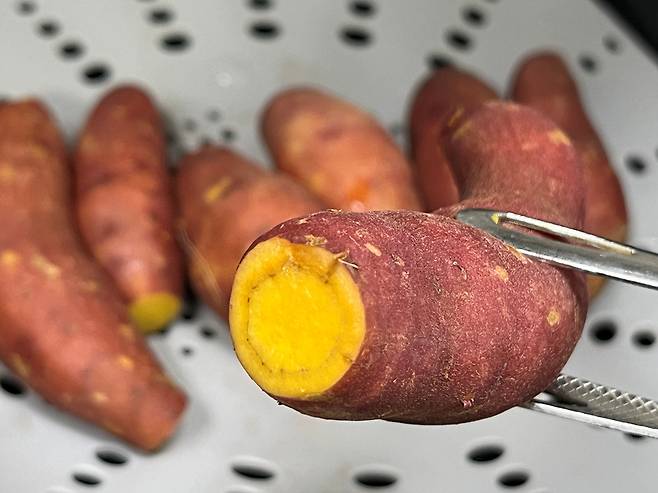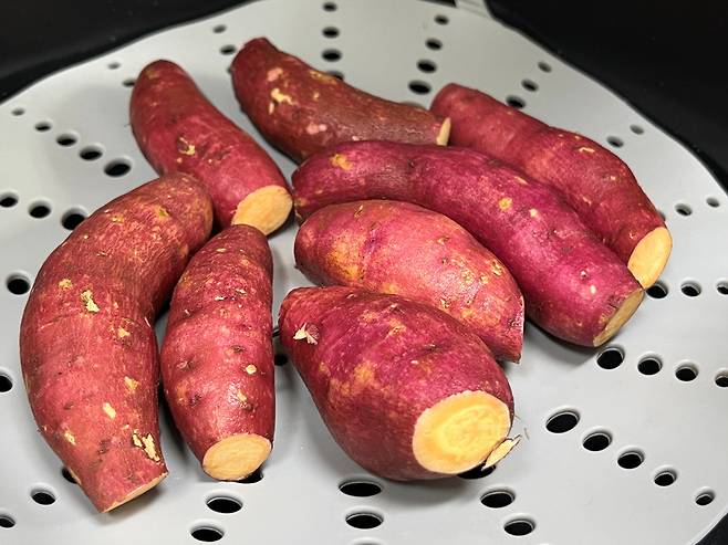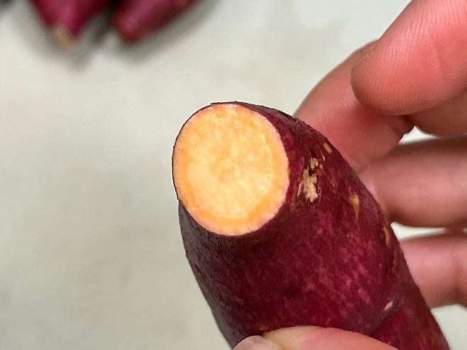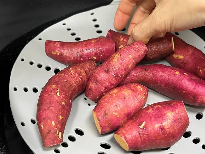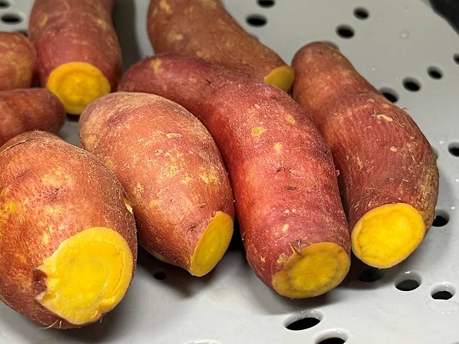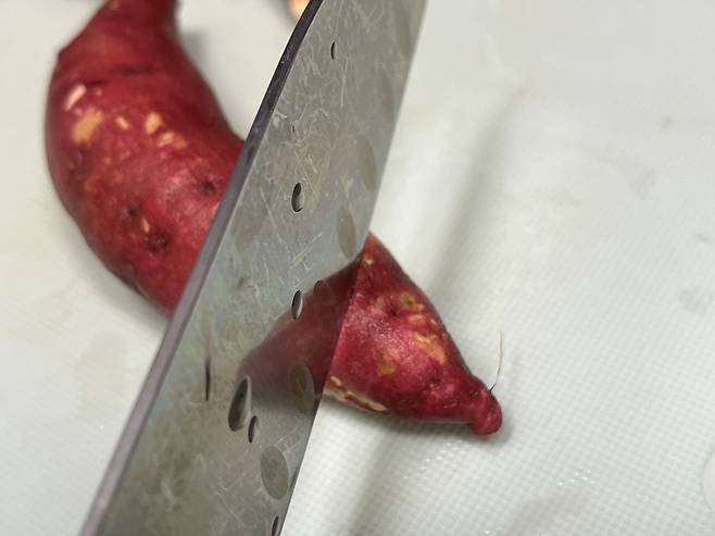 고구마 양끝 부분을 자르면 조리할 때 열이 더 골고루 전달되면서 고구마 속의 녹말이 당으로 바뀌면서 고구마가 더 달달해집니다.