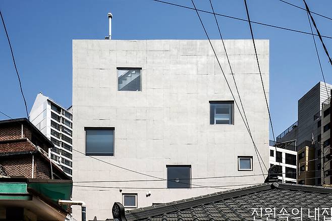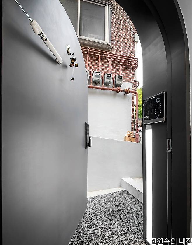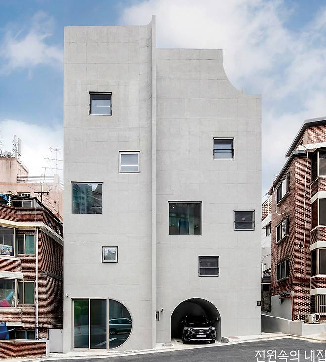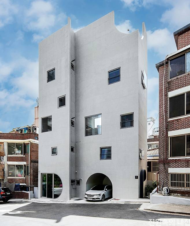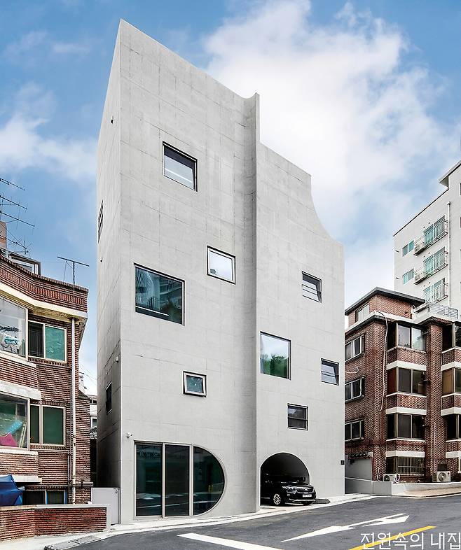 3대가 살아가는 집을 납작한 모양의 작은 대지에 담기 위한 여러 시도가 있었다. 설계가 여러 번 바뀌었는데, 면적을 향한 고민과 함께 설계 기간 동안 오른 건축 물가로 인한 고민이었다. 처음 요구사항이었던 중정 공간은, 가로로 긴 대지의 특성상 구현이 어려워 옥상의 야외공간을 다채롭게 하는 것으로 해소했다. 또다른 요구사항이었던 외관의 벽돌 미장은 벽돌 자체의 두께로 인해 외벽체가 두꺼워지고, 이는 곧 면적 확보가 어려워짐을 뜻했다. 시공비 절약도 필요했던 상황이기에 두께를 최소화할 수 있는 노출 콘크리트를 여러 샘플을 보며 결정했다. 또 면적을 고려하다보니 보일러실이 전면으로 계획되어 연통이 튀어나올 수 밖에 없었는데, 이를 곡선의 매스를 통해 가려 부드러운 외관을 완성했다.