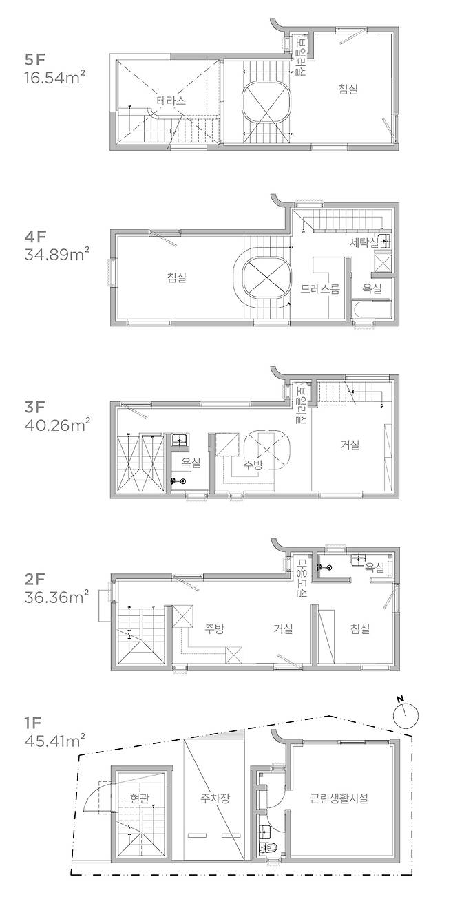서로를 연결하는 공간이 있는 협소 상가주택 사례.