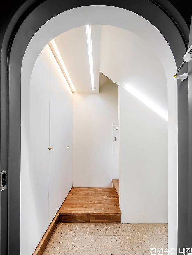 노출 콘크리트로 구성된 적은집의 외관에서부터 곡선 존재감이 드러난다. 수직 동선의 중심이 되는 두 계단실은 그 자체로 설계의 중심 역할을 한다. 최소한의 계단을 이용해야 편리한 부모님 세대는 온전히 2층을 사용하고, 3층에서 5층까지는 건축주 부부와 두 아들의 공간이다. 특히 자라날 아이의 공간이 필요할 것을 대비해 스킵플로어를 활용해 미래의 공간 재구획을 대비했다. 곡선과 아치는 내부 인테리어에서도 중요하게 작용한다. 3층부터 시작되어 5층까지 반복되는 중앙계단 선을 부드럽게 함으로써 시선과 움직임에 편안함을 더한다. 또한 중앙 계단을 완전한 실로 막지 않고 일부를 틔워 층으로 구분된 가족들의 시선이 통하는 공간으로 연결되도록 했다. 옥상에서는 구석의 한 부분을 곡선으로 깎아내듯 시선을 틔웠다. 이는 적은집 C3318만의 조망권을 보장하는 뷰포인트다. 건축주는 초기 의도와 설계가 조금 바뀌었음에도 선택과 집중을 통해 만족을 느낄 수 있었다고 조언했다. 10가지의 요구사항을 모두 실현하려 하기보다는, 한두 가지의 포인트를 중심으로 설계를 고민하며 타협하는 것이 방법이 될 수도 있다는 것. 도시에서 살아가는 이들에게 하나의 새로운 삶의 유형이 되어줄 수 있는, 좋은 예시의 건축이다.
