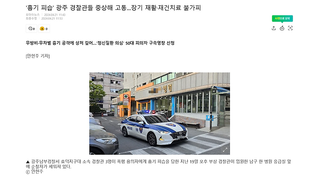 이 사진을 보라. 지난 2월 26일 새벽 광주 금남로 골목에서 한 경찰관이 50대 남성이 휘두른 흉기에 찔려 쓰러지고 있는 모습이다.경찰관은 남성을 제압하는 과정에서 실탄이 든 총기를 사용했고. 총에 맞은 남성은 결국 사망했다.