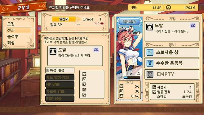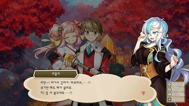 그런데 사실 시트린과 라줄리 두 사람은 전투원이 아닙니다. 파티원은 게임의 거점이 되는 학원에서 모집하는데, 종족 별로 직업은 정해져 있지만 내 파티에 넣을 캐릭터의 이름, 성별은 자유롭게 지정할 수 있습니다. 성격은 랜덤으로 부여되는데 그런 성격의 캐릭터가 내 파티에 있다고 생각하면 단순한 파티원이 아니라 조금 더 개성있는 동료로 느껴지게 되죠.